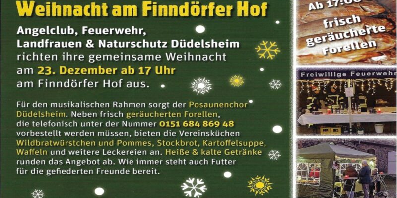 Weihnacht am Finndörfer Hof Angelclub, Feuerwehr, Landfrauen und Naturschutz Düdelsheim richten ihre gemeinsame Weihnacht am 23. Dezember ab 17 Uhr am Finndörfer Hof aus. Für den musikalischen Rahmen sorgt der…