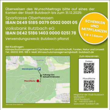 Überweisen des Wunschbetrags bitte auf eines der Konten der Stadt Butzbach bis zum 31.12.2025: