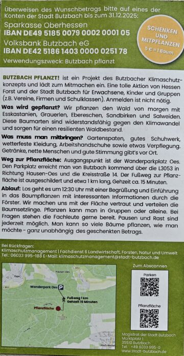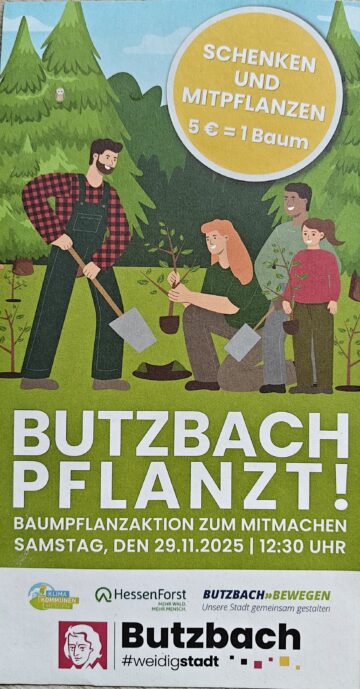 BUTZBACH PFLANZT! ist ein Projekt des Butzbacher Klimaschutzkonzepts und lädt zum Mitmachen ein. Eine tolle Aktion von Hessen Forst und der Stadt Butzbach für Erwachsene, Kinder und Gruppen (z. B. Vereine, Firmen und Schulklassen). Anmelden ist nicht nötig.
